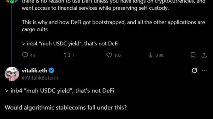 Ethereum co-founder Vitalik Buterin drew a clear boundary around what he considers “real” decentralized finance (DeFi), pushing back against yield-driven stablecoin strategies that he says fail to meaningfully transform risk.